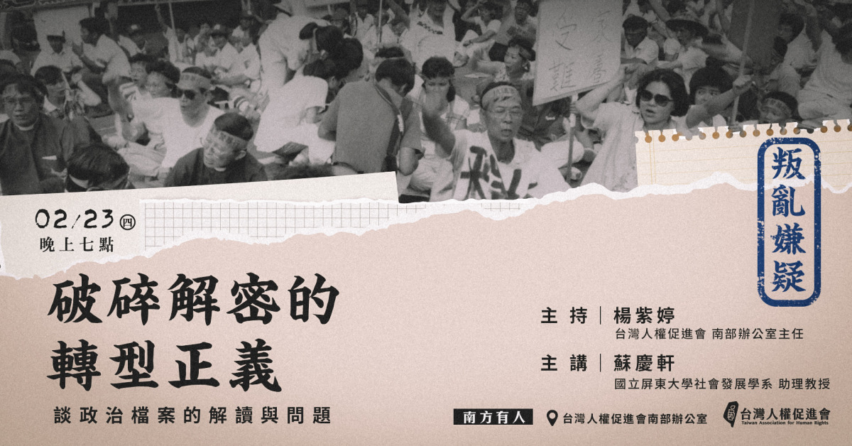 有鑑於此,本次講座邀請到國立屏東大學社會發展學系,研究戰後台灣政治史與轉型正義的蘇慶軒助理教授,來和我們談談政治檔案是什麼、如何解讀政治檔案、檔案公開的揭露義務與程度,以及台灣目前的轉型正義進展與阻力。