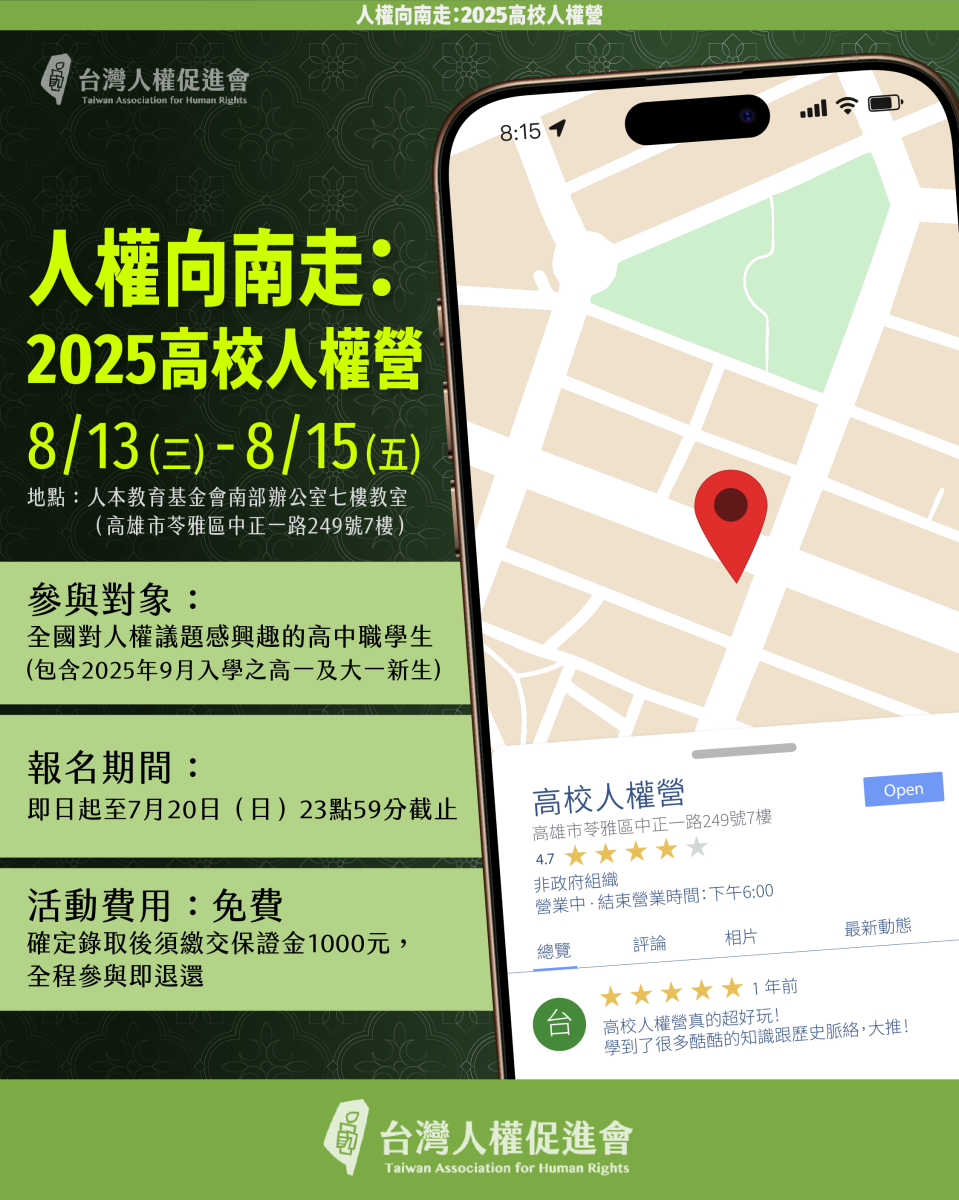 參與對象:全國對人權議題感興趣的高中職學生(包含2025年9月入學之高一及大一新生)
