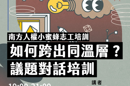 身在島嶼南方的你,有時是否覺得人權議題總是有點遙遠?在網路上關心著這片土地,卻發現一個又一個活動都遠在台北,不知該從何開始參與?或者說,想參與議題,卻又苦無同伴討論取暖? 在這邊邀請你,和我們一同成為南方的小蜜蜂,...