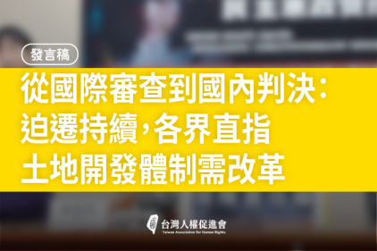 歷次《兩公約》國際人權審查中,國際人權專家都曾針對台灣的居住權保障與迫遷問題,提出明確批評與具體建議,要求政府進行結構性的制度改革。 然而,儘管政府在後續的追蹤會議及《國家人權行動計畫》中屢次承諾將改善相關制度,...