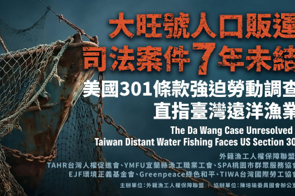 大旺號7年未結,美國啟動301調查 漁工盟籲改革台灣遠洋漁業終止強迫勞動 【 2026 年 4 月 2 日臺北】兒童節前夕,當年爆發疑似外籍漁工遭強迫勞動致死的遠洋漁船「大旺號」案件已屆滿七年,船上的人口販運受害者...